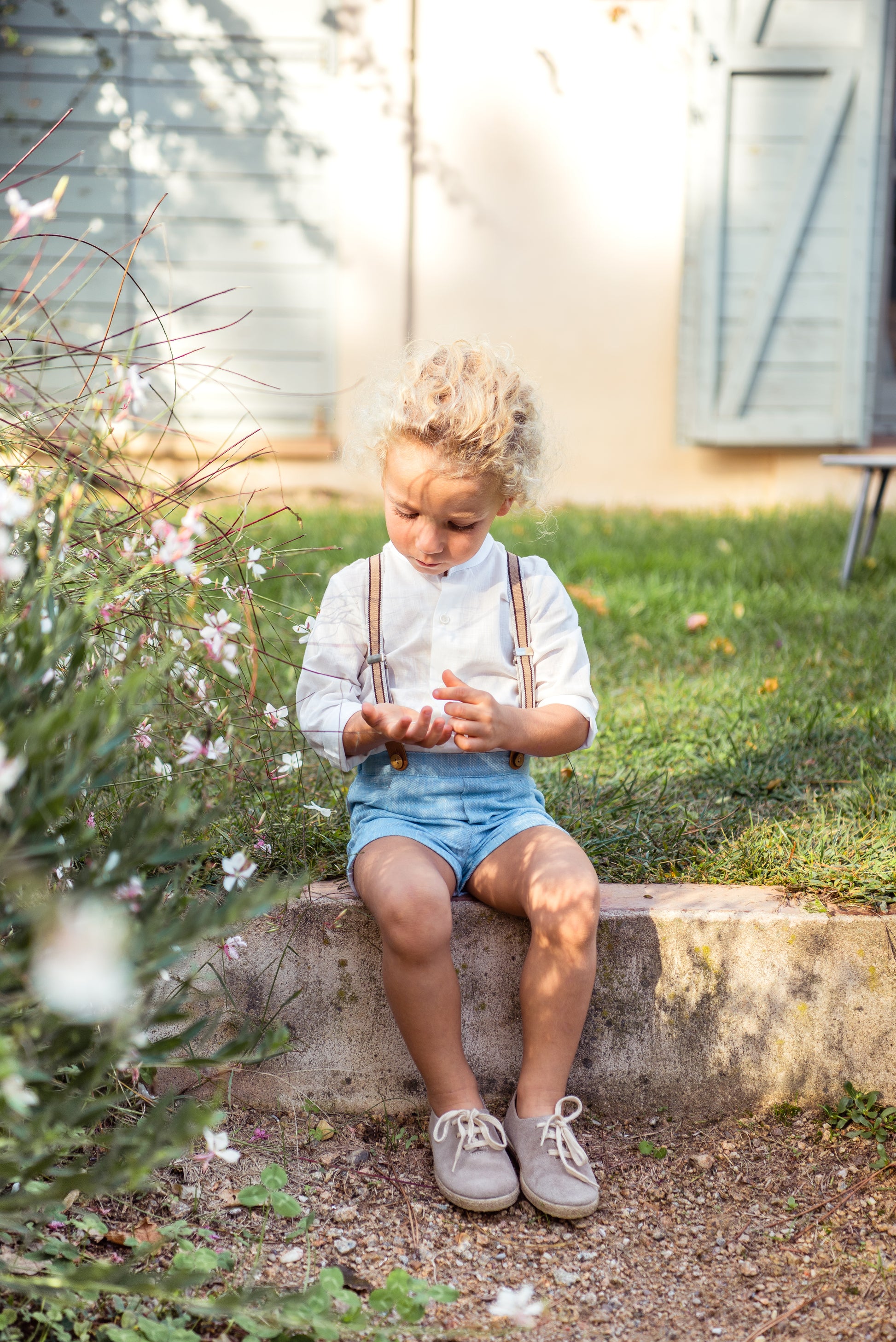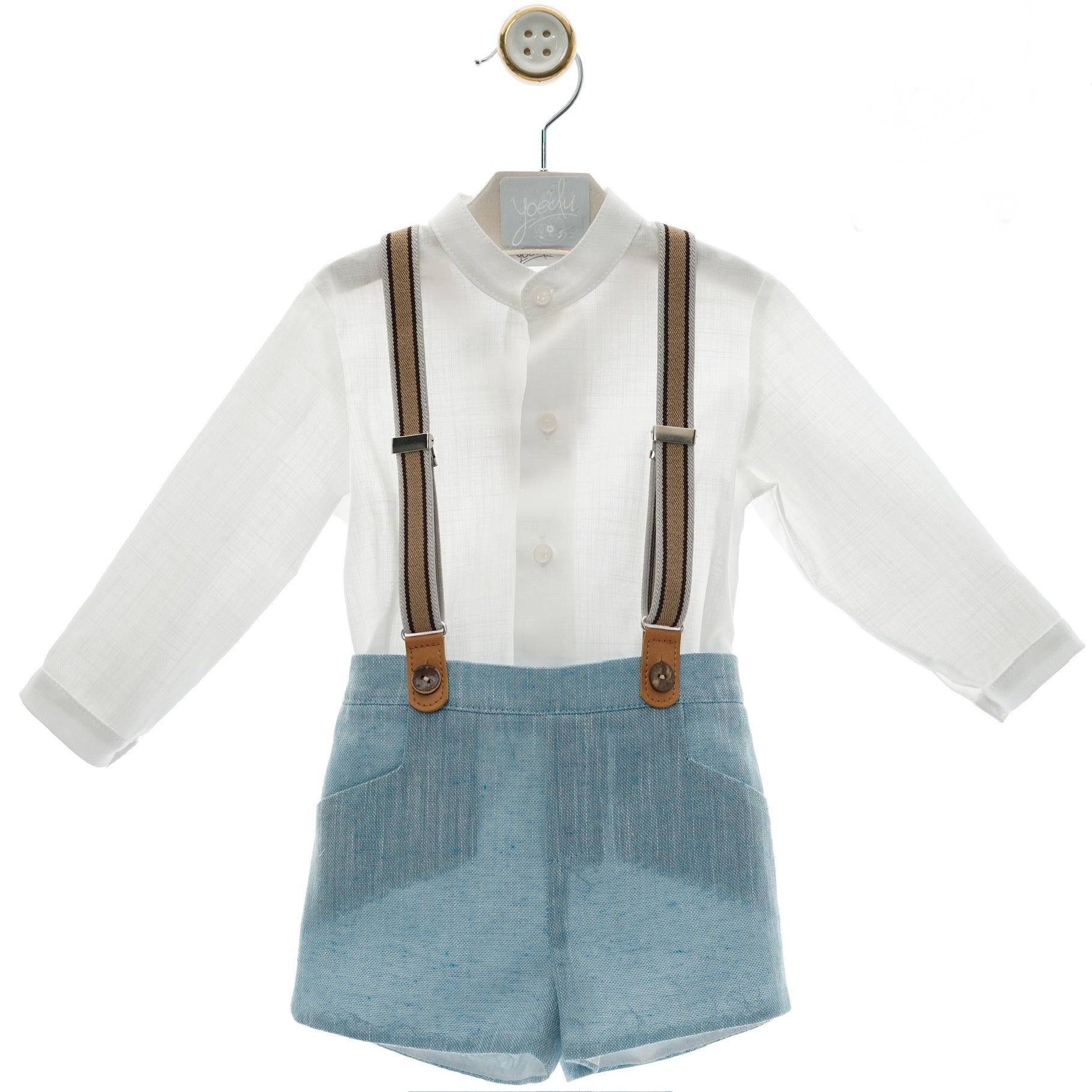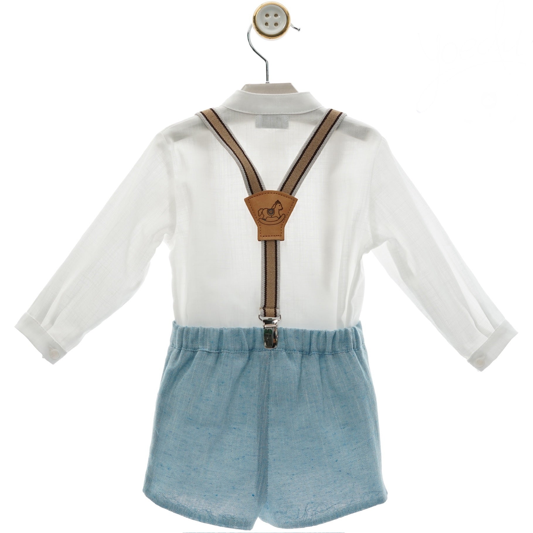 This elegant boy's set features stylish blue shorts paired with a crisp white long-sleeved shirt and classic suspenders. Perfect for special occasions, it combines comfort and sophistication to keep your little one looking sharp and feeling confident all day long. Elevate his wardrobe with this timeless ensemble designed for both charm and ease.